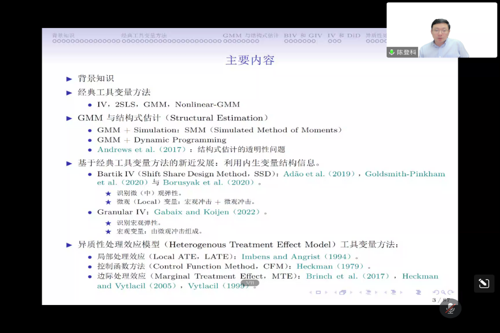 陈登科博士的学术报告主要从经典计量经济学视角来介绍Shift Share Designs, Granular IV以及MTE等新近展的工具变量方法论。他介绍了现代工具变量的基本发展和核心方法,分析针对计量经济学工具变量的使用和实证研究过程中经常遇到的问题。主要内容包括背景知识、经典工具变量方法、GMM与结构式估计、基于经典工具变量方法的新近发展、异质性处理效应模型工具变量方法等五个方面。