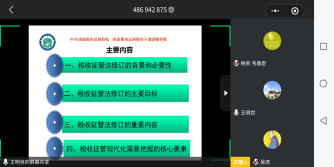 邀请, 国家税务总局扬州税务学院客座研究员,中国税务学会第七届学术研究委员会委员,总局首批征管制度专业人才库成员王明世老师通过腾讯会议为学院师生作了题为“税收征管法修订及前沿问题分析”的线上讲座。学院部分教师和19级税务专业硕士研究生等参加了讲座。