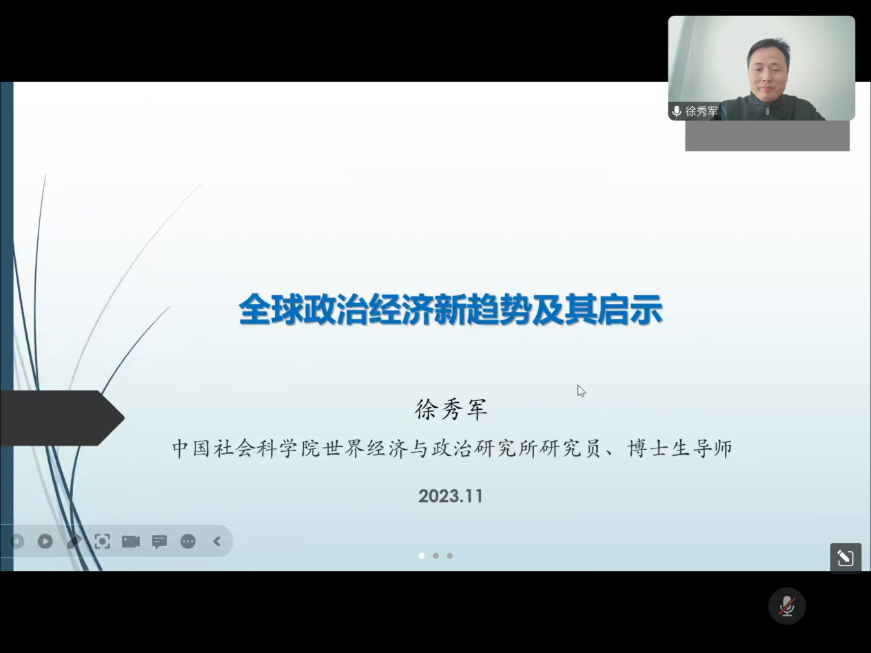 本次讲座分为三个部分:一为国际形势与环境的总体判断,二为国际政治经济的趋势性变化,三为对中国发展战略选择的启示。徐秀军教授指出,当前全球竞争格局出现了重大变化,主要体现在以下几个方面:一是多极化。全球将出现多个竞争中心,包括美国、中国、欧盟、俄罗斯、印度等,这些竞争中心将在经济、政治、军事、科技等领域展开博弈,同时也将寻求合作和对话,以维护全球稳定和发展。二是去全球化。全球化的进程将放缓或逆转,各国将更加重视本国利益和安全,加强对关键产业和资源的保护和控制,减少对外依赖和开放,增加对外干预和制裁,导致全球贸易和投资的减少和分化。三是数字化。数字技术将在全球竞争中发挥重要作用,各国将加大对数字基础设施、人工智能、云计算、大数据、物联网等领域的投入和创新,以提升经济效率和竞争力,同时也将面临数字安全、隐私、伦理等方面的挑战和风险。