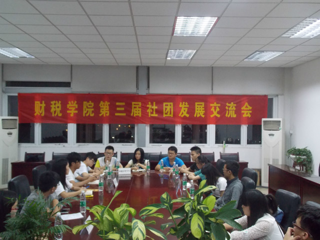 2015年9月17日19点30分,第三届社团交流会于经济学科楼408室召开,出席会议的有:校社联代表,万维讲谭、辩论与演讲协会、城市之光志工社、经纬地理学社四社团的负责人,财税院学生会主席及院会组织部部长们。