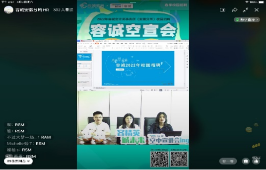 活动主要分为线上参访和线上答疑两个环节。线上参访环节中,容诚会计师事务所的工作人员通过直播的方式向同学们全方位地展示了容诚会计师事务所舒适的工作环境,装修精良的前厅、宽敞明亮的会议室、干净整洁的工作台,同学们深深感受到知名企业的69成人网和人文关怀。接着,工作人员为他们详细介绍了会计师事务所的业务模块,使得同学们了解会计师事务所的业务构成和岗位工作内容,树立明确的就业目标。最后,工作人员公布了容诚会计师事务所校招时人才选拔的标准和多种多样的职位申请渠道,激励着同学们以会计人才选拔的高要求严格锻炼自己。随后的线上答疑环节,同学们自由在直播评论区进行评论,由事务所的工作人员解答疑问。“能再详细说说实习期的问题吗”、“如何分配部门”、“想问一下之前的‘容耀生’计划”、“请问应用统计有可投岗位吗”……容诚会计师事务所的工作人员对每一个问题都做出了详细的回答,最后还送出了5张面试直通卡,为同学们提供暑假实习的机会。