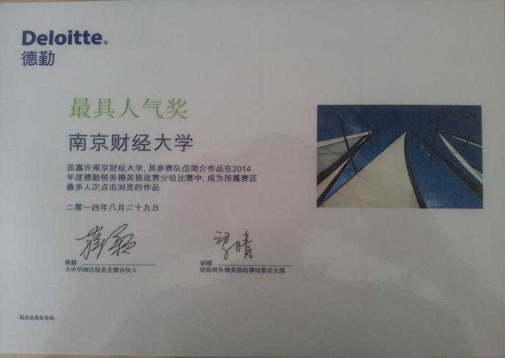 该比赛分为分组比赛与全国比赛两个阶段。在2014年8月30日的分组比赛中,我校代表队脱颖而出,不仅获得2014年度德勤税务精英挑战赛(上海赛区)“最具人气奖”,而且成为江苏高校中唯一一支成功晋身全国决赛的代表队和64所高校中晋身全国决赛的13支队伍之一(其他12支代表队为北京大学、国立政治大学(台湾)、东吴大学(台湾)、香港理工大学、澳门大学、华中科技大学、中山大学、上海财经大学、中南财经政法大学、西南财经大学、江西财经大学和广东外语外贸大学)。