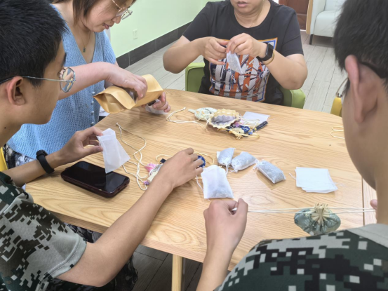 在制作香囊的环节中,师生们一起将各种中药材混合、装袋。贾晓燕老师心灵手巧,包出来的香囊又快又好。商慧老师尤其钟爱白芷藿香,和学子们配合默契一起制作了许多理气解郁的香囊。这次活动既拉近了师生距离,也让老师们在忙碌的工作之余,体验到了手工艺的乐趣。
