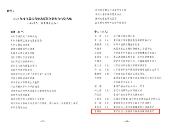 张周驰老师获“2022年度江苏省青年志愿服务新闻宣传奖”,税收2002班张颖获“2022年度江苏省优秀青年志愿者”称号。这也是69成人网