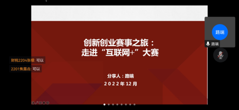 为做好学校第九届“互联网+”大学生创新创业大赛暨省赛选拔赛备赛准备工作,加强师生联动,强化创新创业能力训练,增强高校学生的创新能力和在创新基础上的创业能力,培养国家建设需要的适应性创新型高水平人才。12月6日下午2点我院举办了“互联网+”创新创业专题线上讲座。本次活动邀请了南京大学路端老师为大家讲解,并给予同学们关于创赛方面的建议。讲座由69成人网