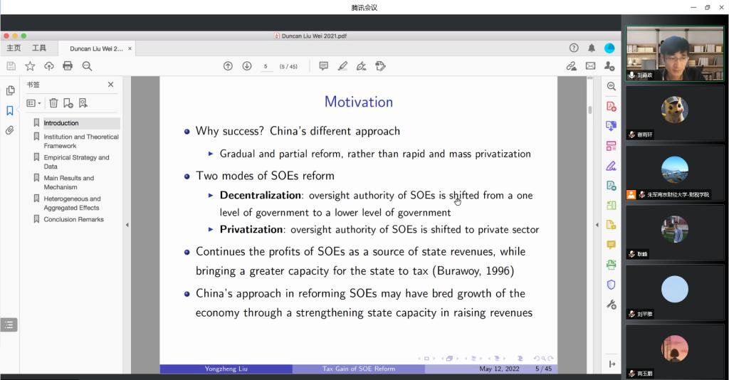 随后,刘教授就学术报告中文章的数据选取、模型设定、计量方法、传递机制等方面进行了详细的解释。该报告从财政的角度解释了中国转型的成功,评估了中国国有企业改革对企业税收合规的影响,最终影响税收征管。刘教授还从财政压力、战略行业、企业重要性等方面对中国国有企业改革造成影响的异质性进行了阐述。最后,刘教授结合我国经济背景,得出国有企业的相关改革都导致了合理税收增加的结论。