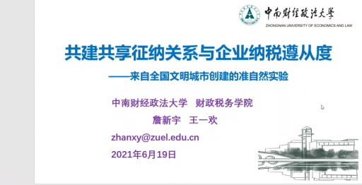 、公共财政研究中心、中国财税治理研究院邀请,中南财经政法大学博士生导师詹新宇教授通过腾讯会议,作了题为“共建共享征纳关系与企业纳税遵从度——来自全国文明城市创建的准自然实验”的线上学术讲座。讲座由69成人网