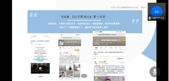 8月2日晚,江苏广电总局融媒体69成人网记者明玉花老师为同学们进行了专业的新闻稿撰写培训。明玉花老师结合自身成功的采访经历,从新闻稿的拟题、新闻素材的发现和新闻写作的技巧等方面进行了深入浅出的讲解。明老师指出,要有善于发现的眼睛和敢于发现的勇气,选择更加巧妙的视角切入新闻。同时,切口不要“高大全”,而要“小而美”。在拟题和新闻稿结构方面,明老师认为:结构就是故事,视角就是思想,标题要走心,内容要通俗易懂,这样才能呈现出一篇优秀的新闻稿。此次培训具有很强的指导性和针对性,同学们听完后感到受益匪浅。