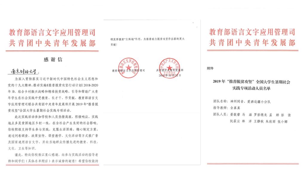 近日,教育部语言文字应用管理司和共青团中央青年发展部联合向我校发来感谢信,对我院的助力“推普脱贫攻坚”专项暑期实践活动表示感谢,对参与此次活动的师生予以表扬。