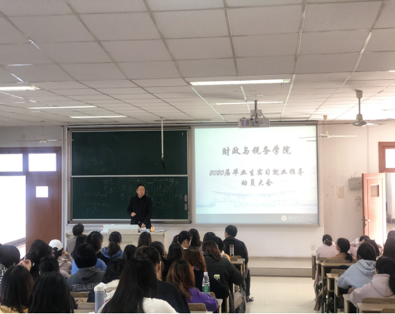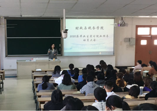 2020届毕业生实习就业动员大会在博远楼103教室举行。党委副书记李慕原,副院长田志刚,财政系主任李婧,税务系主任汪卢俊参加了动员大会,大会由2016级辅导员李玲老师主持。