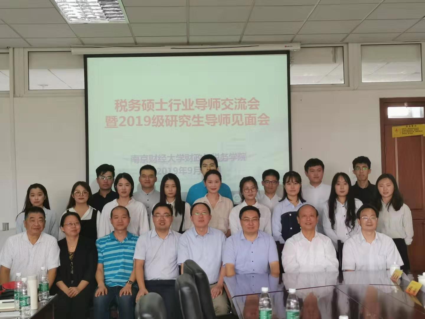 仙林校区德经楼408会议室召开了税务硕士行业导师交流会暨2019级研究生导师见面会。江苏省人大财经委江建平老师、江苏文投集团王国丰老师、江苏宿迁税务局吴健老师、中国邮储银行南京庐山路管辖支行于文国老师等行业导师参加了见面会。会议由副院长管永昊主持,学院部分党政领导和教师、全体19级税务专业硕士研究生等参加。