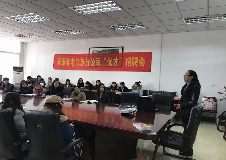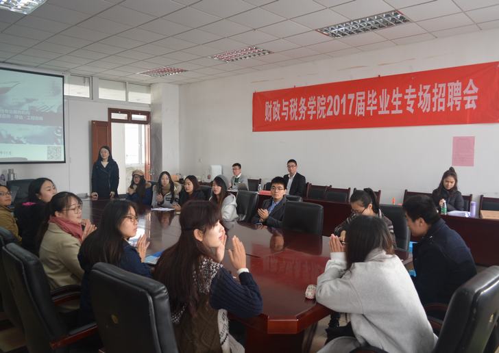 在经济学科楼408会议室举办2017届毕业生专场招聘会。学院邀请了泰康养老保险股份有限公司江苏分公司、中税咨询集团、中汇税务师事务所江苏有限公司、中瑞岳华税务师事务所江苏有限公司等多家用人单位前来参加,提供了财政、税务、财务、会计、市场营销、新闻、软件开发等一百多个岗位计划。其中,泰康养老保险有限公司和中税咨询集团分别进行了专场招聘。