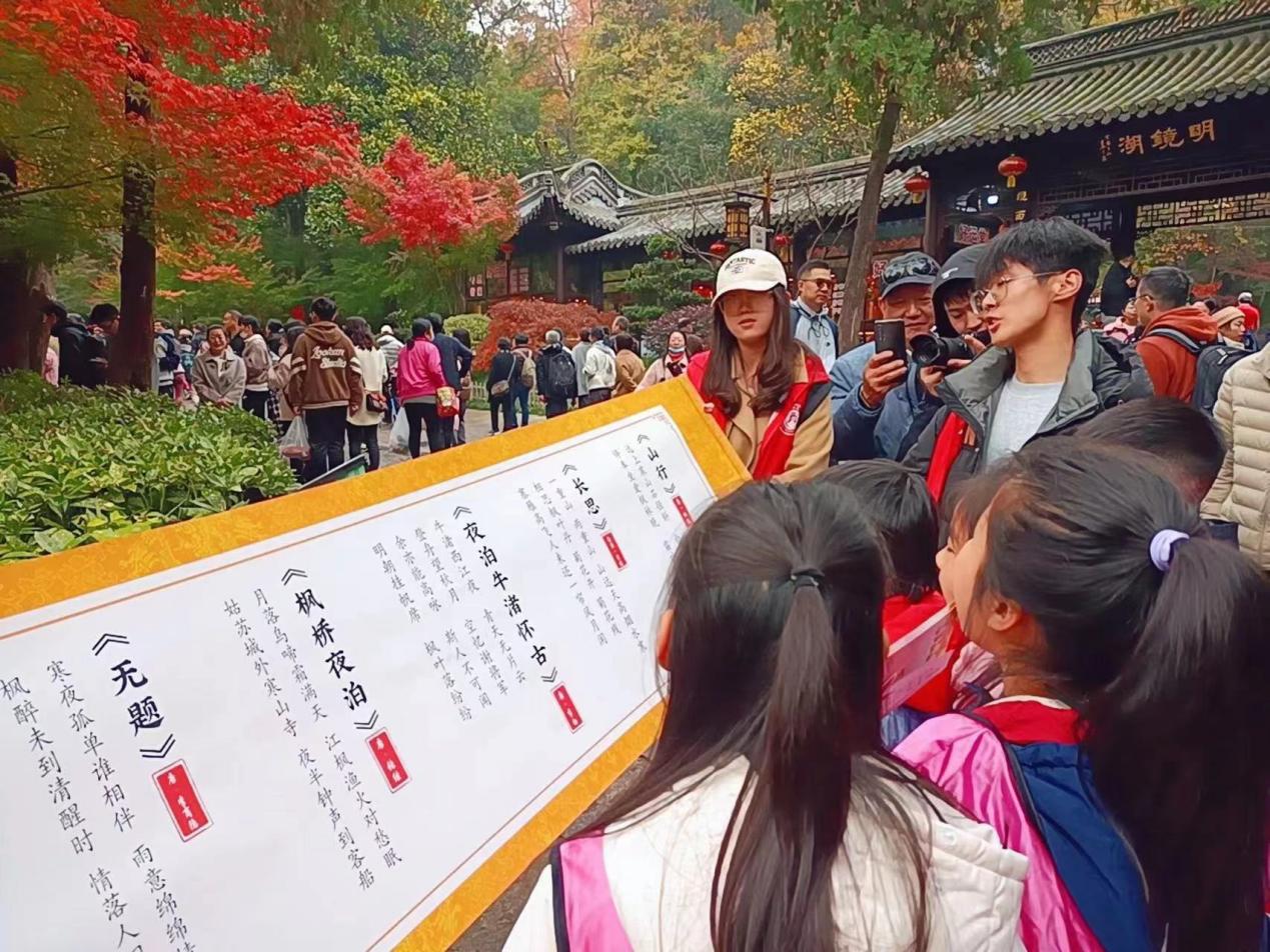 (志愿者们带领小朋友在栖霞山赏枫叶,开展特色志愿活动)