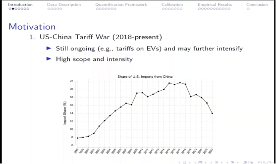 马弘教授首先从时间角度对近20年美国对中国加征关税的现象和特点进行了介绍,提出关税的加征对美国消费者带来了不利的影响,介绍了消费品的分类分析富人和穷人在消费品选择上的差异,通过相关消费者数据的回归统计,分析了为何越富有的群体受到关税加征的影响越小。