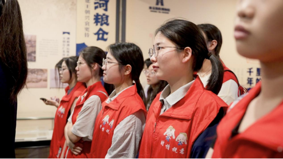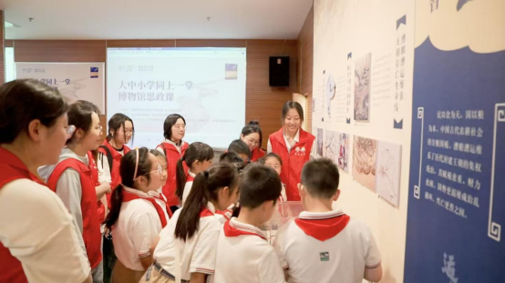 “红途税月”志愿讲解队带领中小学生们体验了最新推出的“运河税韵”触摸展品互动区和历史场景还原影视区。随后,来自南京市的小学、中学、大学的三位教师代表带着学生们,把“教室”搬进了南京税收博物馆《运河税韵里的千年变迁》专题展厅。
